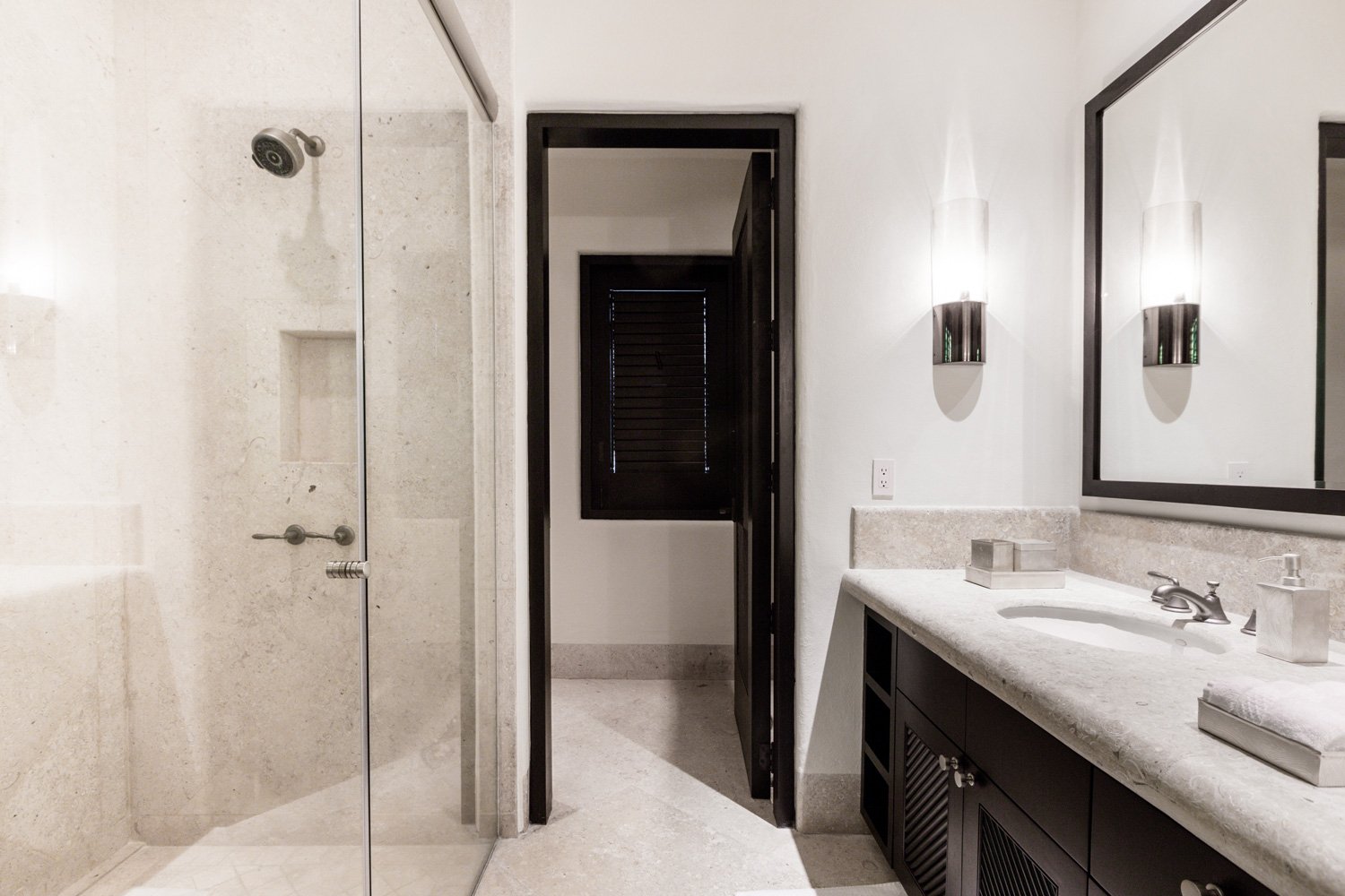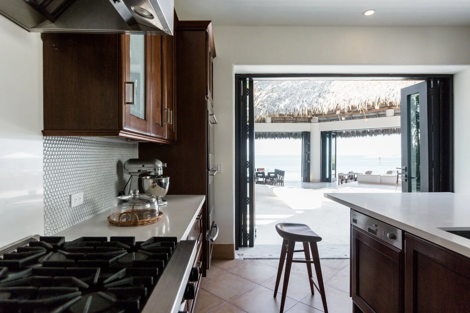 The chef’s kitchen is outfitted with high-end stainless steel appliances, custom wood cabinetry, and generous counter space, offering the perfect balance between gourmet convenience and relaxed entertaining. Whether enjoying a quiet evening in or hosting a lively beachfront gathering, Casa Fortuna is designed to accommodate any occasion.